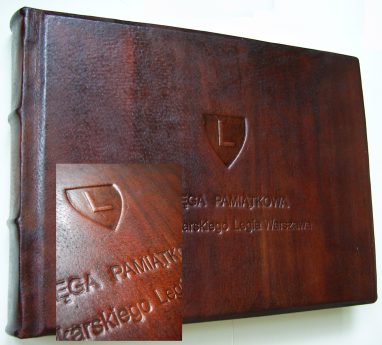 ![]() Oprawa skórzana, szycie na sznury, prawdziwe zwięzy na grzbiecie, kapitałki szyte ręcznie, tłoczenia na okładce przedniej Format 42 x 28 cm., 200 kart 120 g/m2 papier ozdobny 120 g/m2 - skóra licowa ręcznie antykowana - wyklejka z papieru ozdobnego |