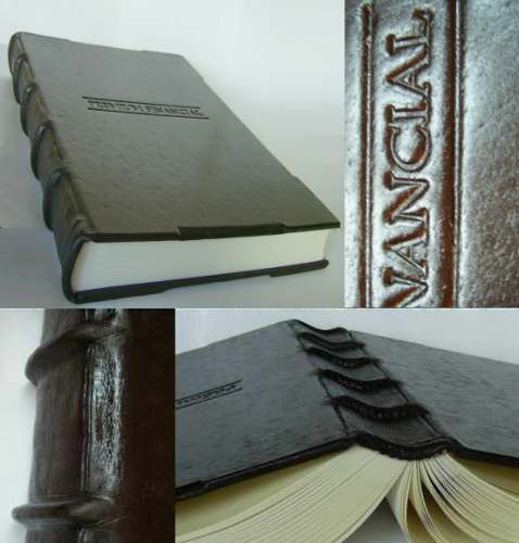 ![]() Oprawa skórzana z grzbietem zwartym, szycie na sznury, prawdziwe wysokie zwięzy na grzbiecie, kapitałki szyte ręcznie, głębokie tłoczenia suche logotypu, stylizowane krawędzi okładek. Format B3+, 250 kart, papier ozdobny 120 g/m2 - skóra licowa - wyklejka z papieru ozdobnego |