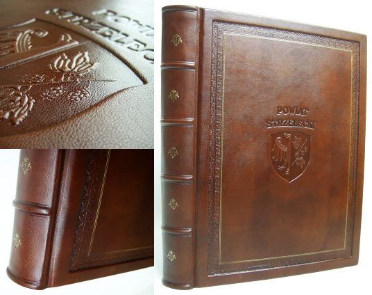 ![]() Oprawa skórzana, szycie ręczne kart, wysokie zwięzy na grzbiecie, kapitałki szyte ręcznie, głębokie tłoczenia ślepe i złotem, barwione brzegi kart, reliefowane płaszczyzny okładek Format 28 x 38 cm, 200 kart, 50 przekładek dystansujących, papier ozdobny 140 g/m2 - skóra naturalna - wyklejka z papieru ozdobnego |