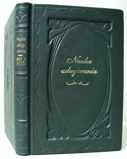 ![]() Oprawa skórzana stylizowana, szycie ręczne na prawdziwe zwięzy, wyklejka z papieru ręcznie marmoryzowanego, tłoczenie złotem tytulatury na okładce przedniej i grzbiecie, zdobienia reliefowe na okładkach, tłoczenia suche. - Format ca B5 - skóra cielęca |