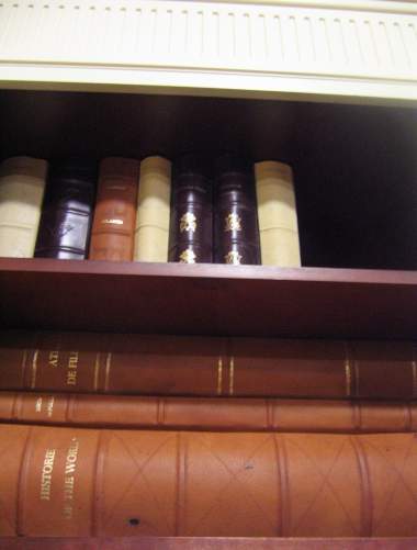 Fragment imitacji księgozbioru, atrapa oprawiona w skórę, imitacja zwięzów, tłoczenia ślepe i złotem, złocona tytulatura na "grzbiecie", szyldziki. Rozmiar: 30 - 34 cm (wysokość grzbietów) x 21 cm (głębokość pudła) x 80 cm (szerokość) - skóra cielęca świńska kozia licowa szlachetna |