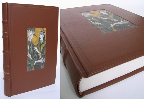 ![]() Oprawa skórzana, wyklejka z papieru ozdobnego, kapitałka szyta ręcznie, złocenie tytulatury na grzbiecie, tłoczenie ślepe zdobień, reliefowe wgłębienie na okładce przedniej z aplikacją papierową. - Format ca B5, 25 ark. - skóra kozia |
