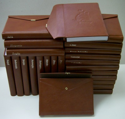 ![]() Oprawa skórzana arabska kopertowa, płócienne wyklejki, wyklejka konserwatorska, kapitałka maszynowa, sztuczne zwięzy, tłoczenia na okładkach, tytulatura na grzbiecie, zatrzask mosiężny. Nakład limitowany. - Format: A5, 27 ark. - skóra licowa, płótno |