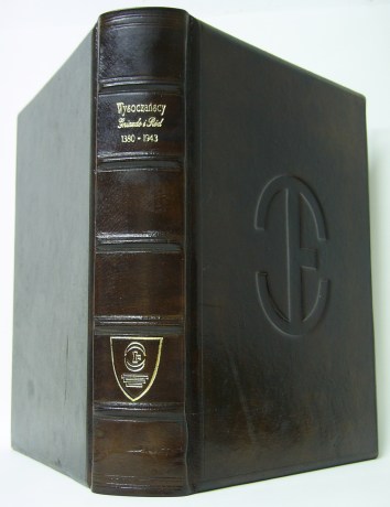 ![]() Oprawa skórzana stylizowana, kapitałka wykonana ręcznie, sztuczne zwięzy, wyklejka z papierów ręcznie marmoryzowanych, tłoczenia tytulatury złotem, na okładce zdobienia suche i złotem, barwione krawędzi kart. Edycja limitowana. - Format ca B3 - skóra kozia |