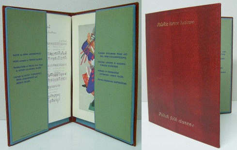 Oprawa skórzana stylizowana, tłoczenia tytulatury złotem na okładce, zdobienia suche i złotem, zakładki płócienne na plansze