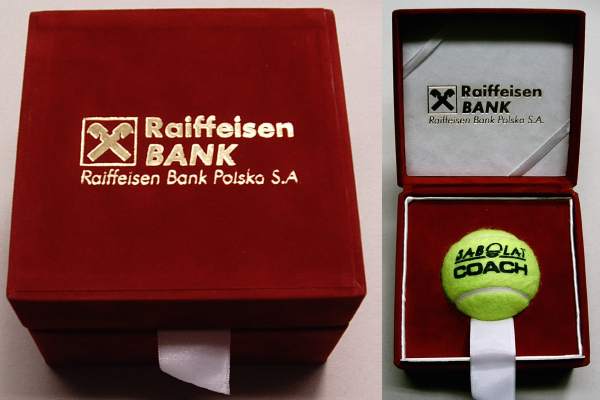 Pudełka z materiału flok, imitacji zamszu, na obiekt - piłeczka tenisowa, oklejone od zewnątrz i wewnątrz flokiem, wnętrze ukształtowane wg rozmiarów przedmiotu zawartości, tłoczenia złotem na wieczku od zewnątrz i wewnątrz, z kolorową lamówką i tasiemkami w narożnikach wieczka od wewnątrz oraz tasiemką ułatwiającą wyjęcie obiektu z pudełka.