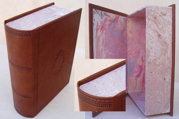 Pudełko z materiału typu ekoskóra, oklejone od wewn?trz papierem ręcznie marmoryzowanym, wnętrze ukształtowane wg rozmiarów przedmiotu zawartości, tłoczenia suche na wieczku.
