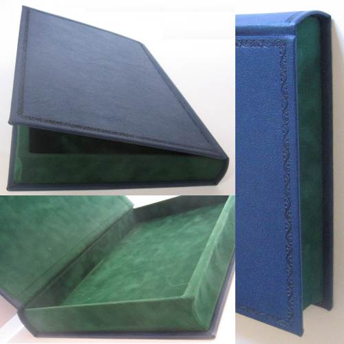 Pudełka na obiekt formatu B5 - atrapa książki, zakrąglone krawędzi "kart" i "grzbiet", wyścielone materiałem imitującym zamsz, wnętrze ukształtowane wg rozmiarów przedmiotu zawartości, tłoczenia ślepe na wieczku.
