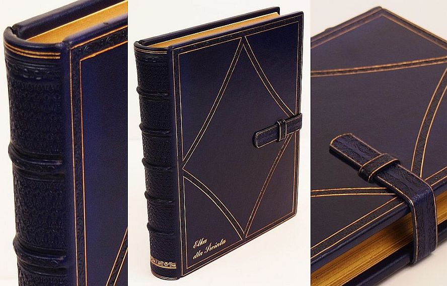![]() Oprawa skórzana albumowa, ręczne szycie z przekładkami dystansującymi karty księgi, zwięzy na grzbiecie, kapitałki szyte ręcznie, tłoczenie ornamentów suche i złotem na okładkach i grzbiecie, zamykana paskiem Format 30 x 24 cm 80 kart, 20 przekładek dystansujących papier ozdobny albumowy 130 g/m2 skóra licowa antykowana wyklejka z papieru ozdobnego złocone brzegi kart skórzany zdobiony pasek |